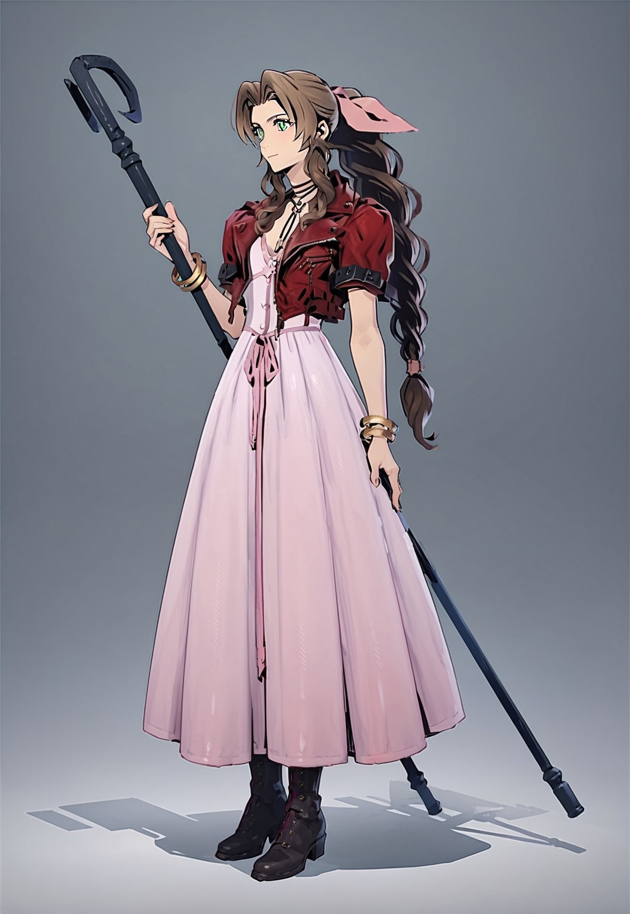 aerith gainsborough, 1girl, solo, long hair, brown hair, jewelry, green eyes, hair ribbon, boots, choker, bracelet, pink bow, staff, pink dress, red jacket, cropped jacket, long dress