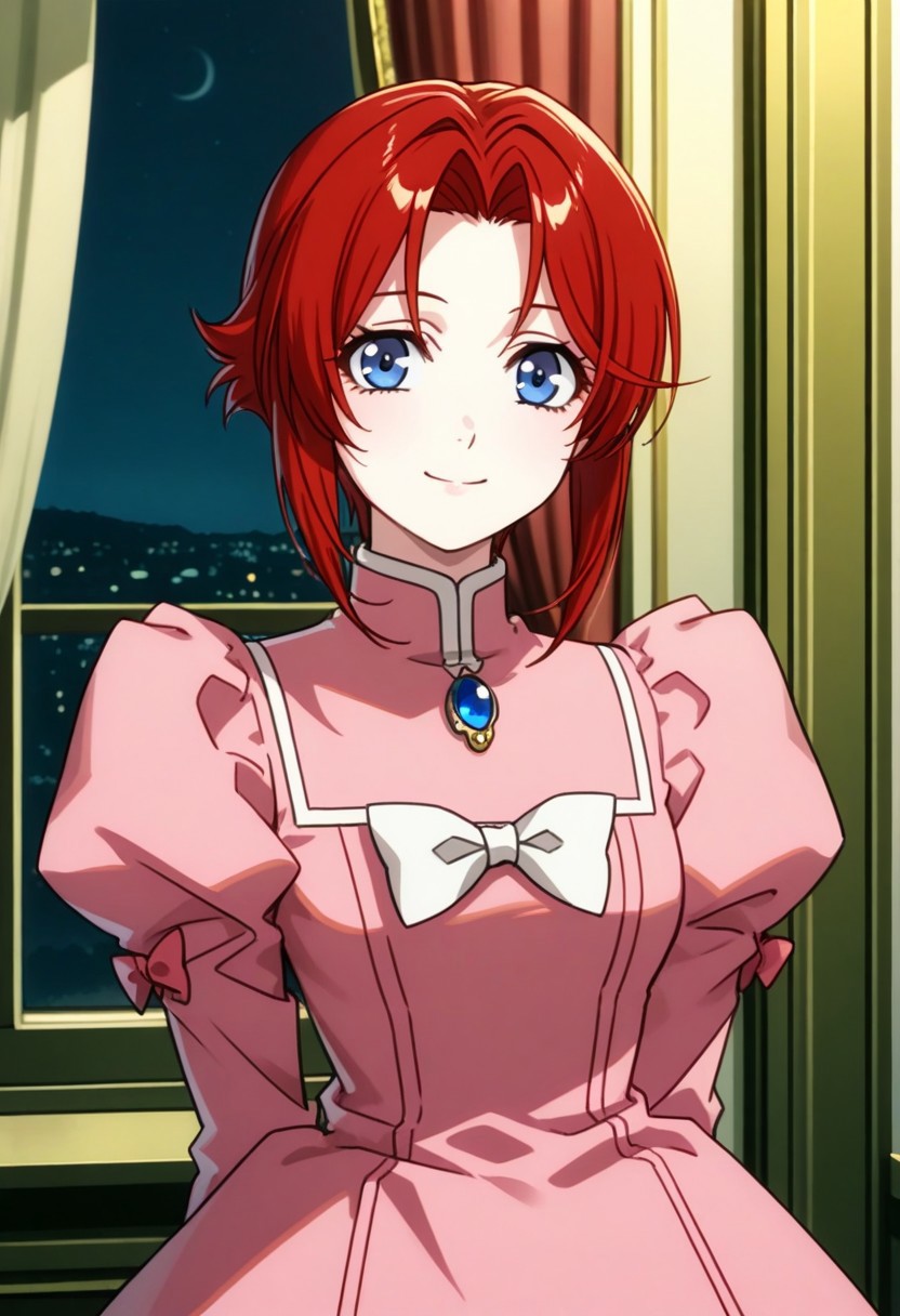 esterblan, 1girl solo, red hair, short hair, blue eyes, jewelry, chocker, dress, pink dress, bow, puffy sleeves,