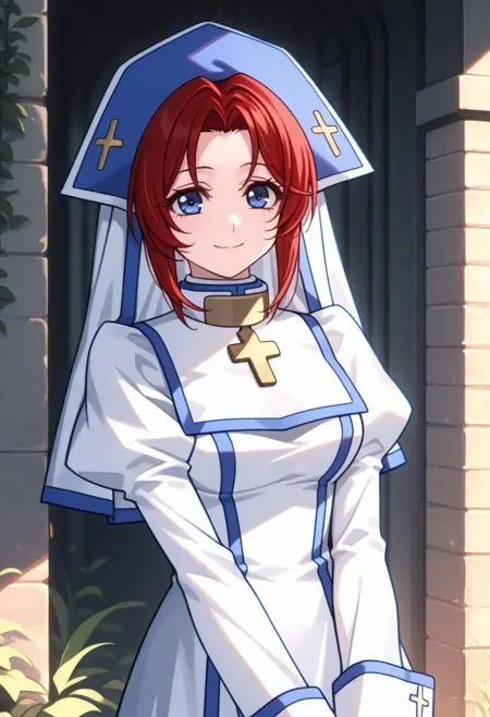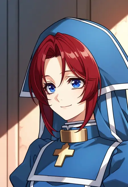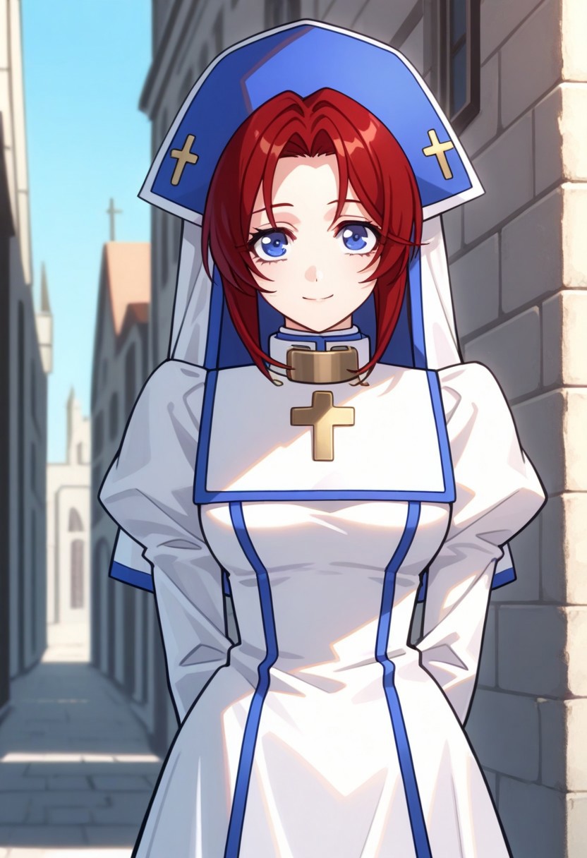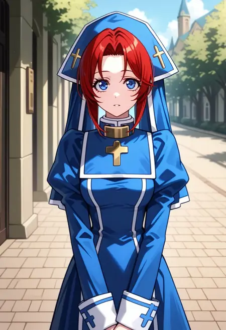 esterblan, 1girl solo, red hair, short hair, blue eyes, nun, habit, blue headwear, dress, blue dress, cross,