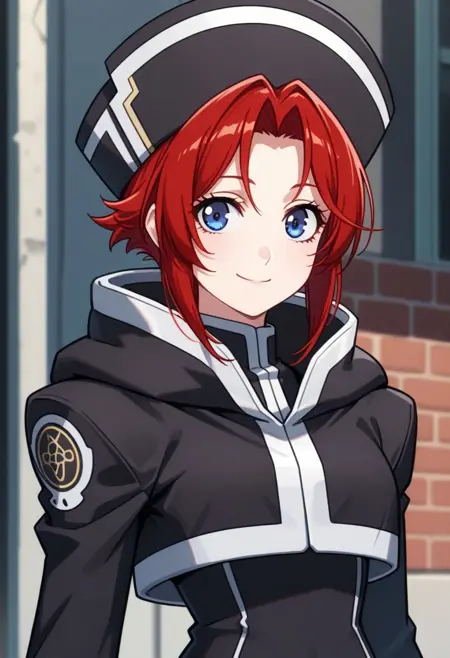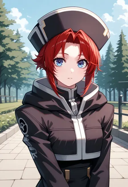 esterblan, 1girl solo, red hair, short hair, blue eyes, hat, black headwear, jacket, black jacket, cropped jacket, long sleeves, hood, shirt, black shirt, pants, black pants,