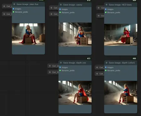 このワークフローでは、ノードの接続線ではなく、SetNodeとGetNodeを多用してメモリ内の設定を通じて情報を移動しています。4つのControlNetプロセッサを画面に表示するだけでも、ノード接続線が非常にごちゃごちゃしていたため、これにより大幅に整理されています。