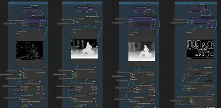 さらに、データを接続線ではなく変数経由で移動させるため、プロセッサグループ全体をコピー&ペーストして独自のものを追加するのが簡単です。多数の接続線を手動で引く必要はなく、新しいControlNetプロセッサ用に専用ノードを差し替えるだけで実行できます。
