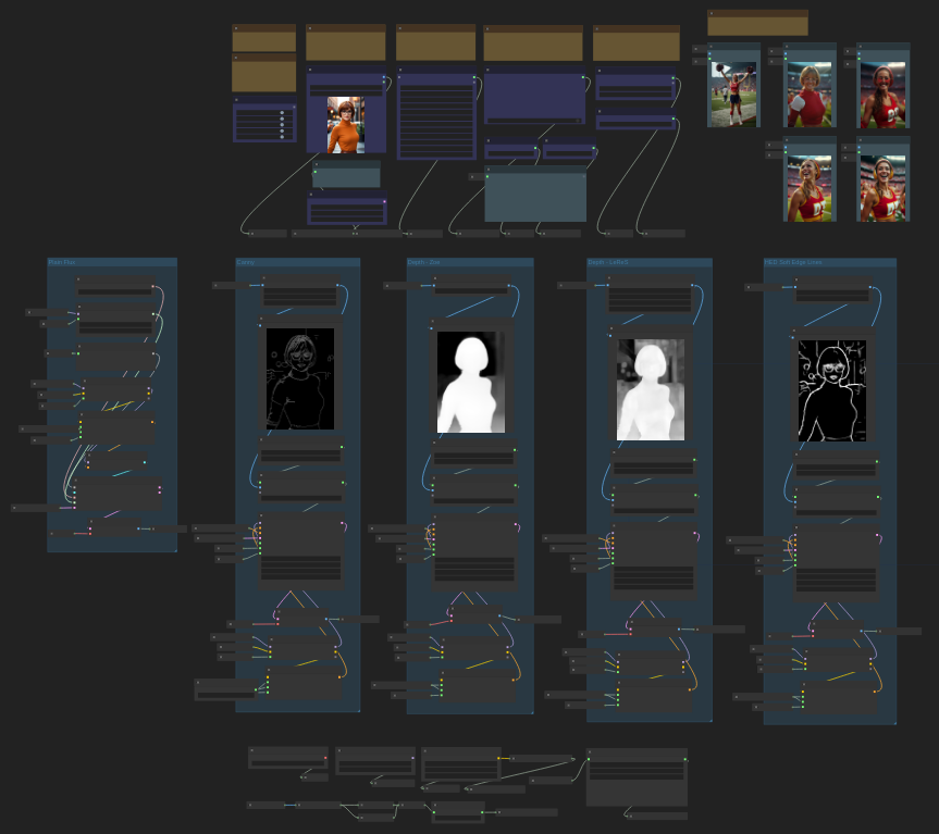 The workflow makes extensive use of SetNode and GetNode to move information through settings in memory rather than node connector lines. Even with just 4 controlnet processors on the screen, the node lines were a little insane, so this cuts down on the clutter by a great deal.