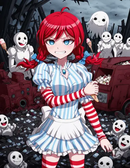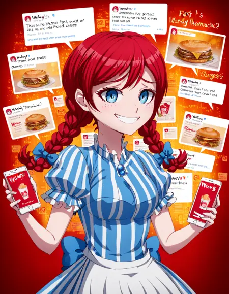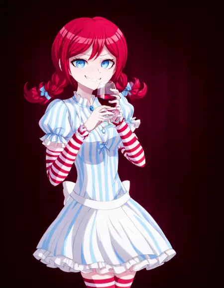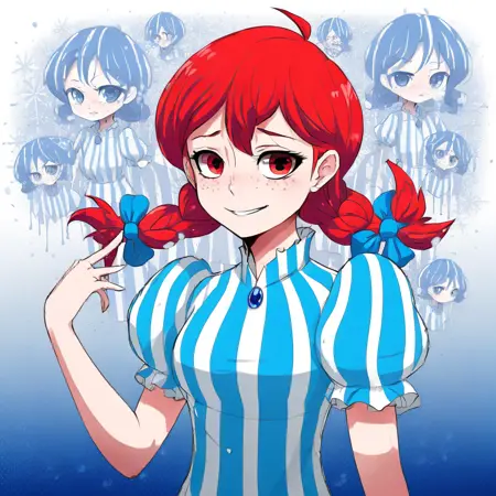 The Wendy's mascot, trained on "Smug Wendy's" meme images. It should do fine making standard images of Wendy. But as the name suggests, it leans toward smugness. I trained on a few different clothing options which you can use with variations of the following prompt.