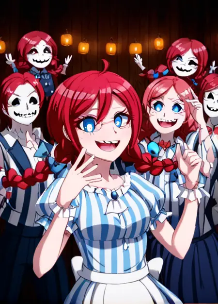 Likewise it goes fairly well in the other direction, giving access to some of Wendy's options for the Danganropa characters. Though you might have to stress some elemets to get them to go through. Hair color in particular. For example, to have Tsumugi Shirogane in Wendy's outfit: lora:Tsumugi\_Shirogane\_SDXL:1, This anime screencap is from Danganronpa the Animation. lora:Smug\_Wendy\_SDXL:1, (((dark blue hair))), Tsumugi Shirogane cosplaying as Wendy Thomas. Tsumugi has a smug expression on her face. Tsumugi has knee-length dark teal-blue hair hair styled in pigtails and parted in the center. Tsumugi is wearing a light blue and white striped dress with puffed sleeves. She has a blue brooch. She is wearing a red and white striped arm warmers. Tsumugi wears round, rimless glasses with white temples. Her eyes are large, round, and are a soft teal-green color. She is also wearing red and white striped thigh high socks. It's a full body image.