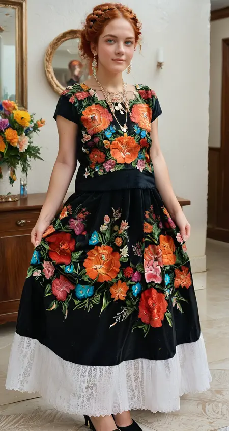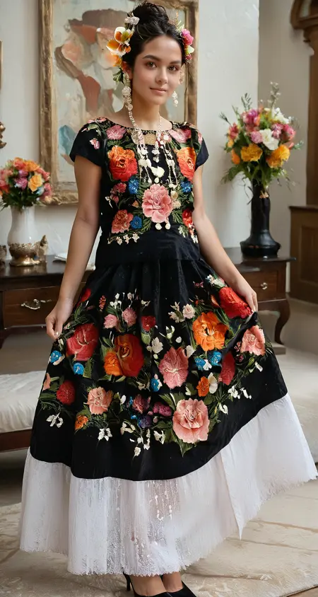 tehuana_dress, black dress, flower dress, white lace, high heels,