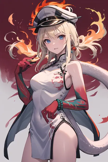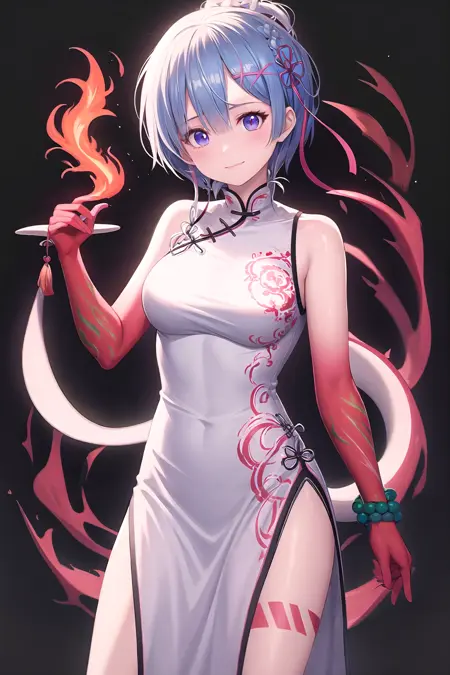 The clothing includes a cheongsam and a sleeve tattoo for cosplay, and you can add tag such as flame-tipped tail.