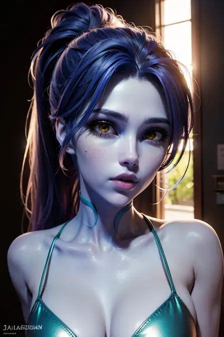 一幅惊艳且精细的全彩超高清肖像,少女,长及腰部的紫色马尾辫,黄色眼睛,面部细节完美,穿着浅蓝色比基尼,史诗级角色构图,Alessio Albi,Nina Masic,锐利对焦,自然光,皮下散射,f2,35mm。