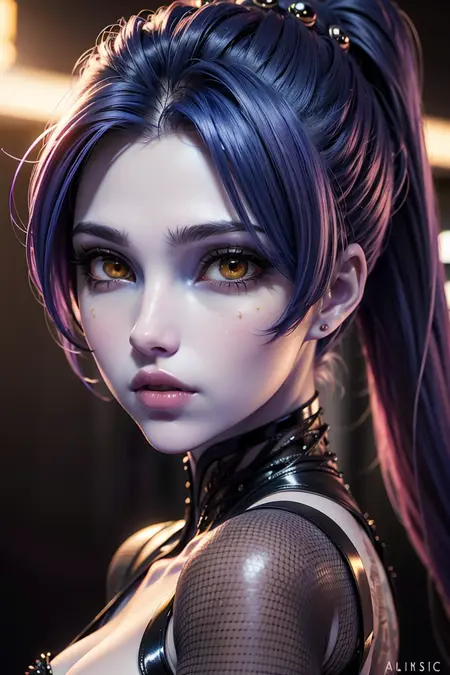 提示:一幅惊艳且精细的全彩超高清肖像,少女,长及腰部的紫色马尾辫,黄色眼睛,面部细节完美,(头戴式护目镜),贴身粉黑相间的盔甲,史诗级角色构图,Alessio Albi,Nina Masic,锐利对焦,自然光,皮下散射,f2,35mm。