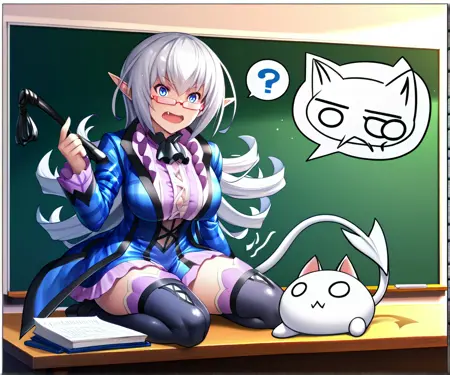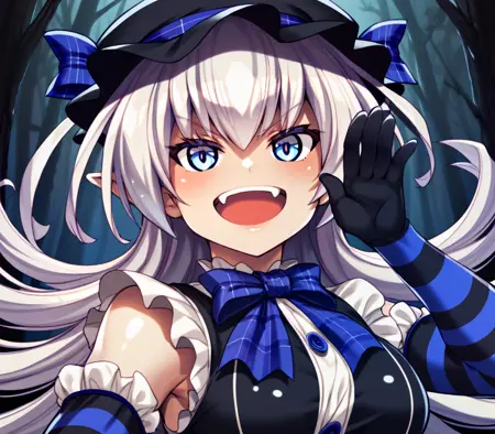她的使魔 Kuro 和 Shiro 在数据中带有各自的标签。你可以生成它们(通常效果不佳),但我主要将它们加入是为了让你能在负面提示中使用它们的标记,以避免生成奇怪的小精灵。以下是它们的标签: