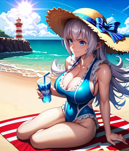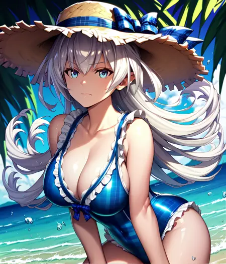 泳装:MiriSwim,草帽,帽饰蝴蝶结,连体泳衣,荷叶边泳衣,侧边开衩,格子泳衣,事业线,凉鞋