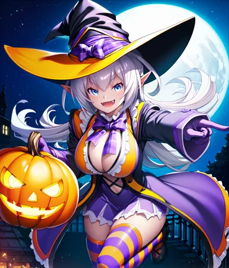 万圣节:MiriHal,女巫帽,长外套,紫色手套,橙色上衣,领结,中间开叉,事业线,荷叶边紫色裙子,条纹裤袜,橙色裤袜,紫色裤袜