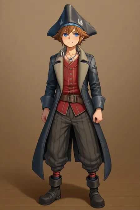 sora, 棕发, 蓝眼, 海盗, 海盗帽, 红色背心, 黑色外套, 1个男孩, 男性聚焦, 单人, 帽子, 条纹七分裤, 项链, 靴子(*头带/头巾可选)