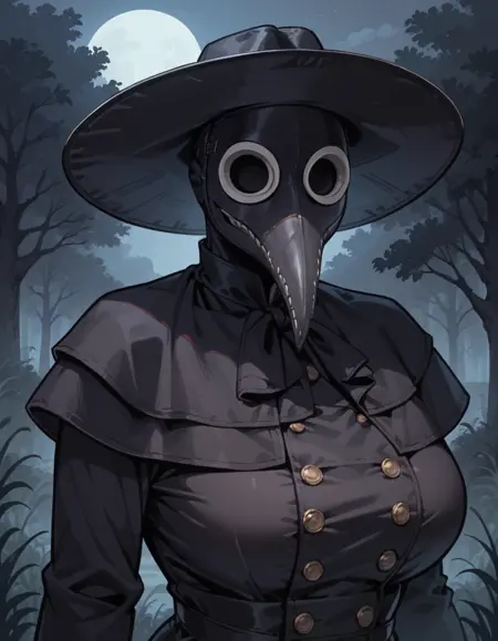 プラーグ・ドク:hud_plagu3_doc、プラグドクター、黒いコート、ボタン、黒い手袋、黒いカペレット、マスク、帽子