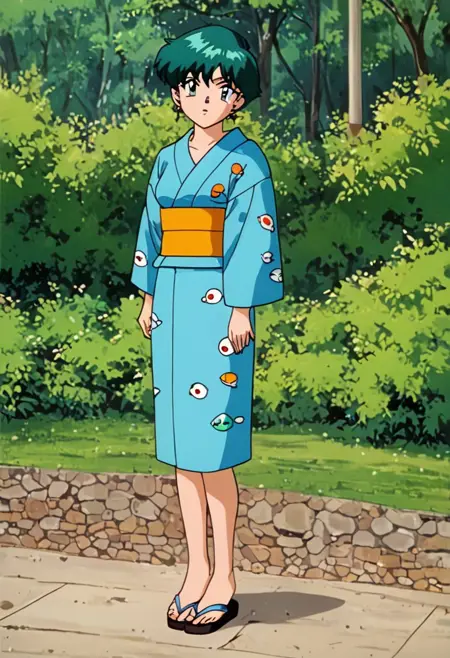OutfitYukata, blue yukata, long sleeves, orange sash, sandals,