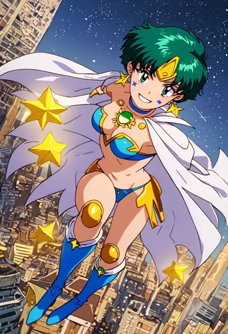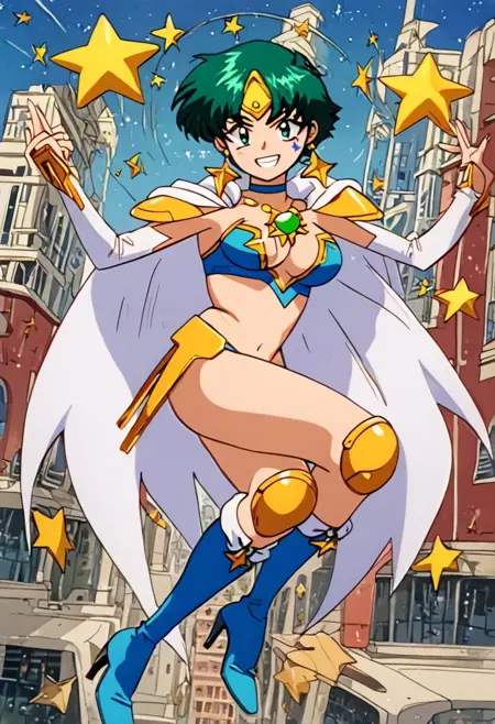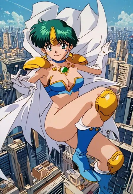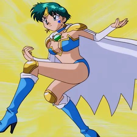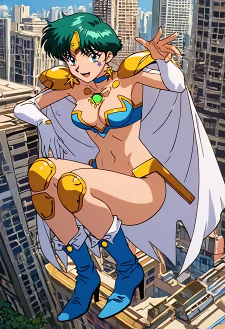 HyperDoll, facial mark, star (symbol), blue bikini armor, (white cape, blue inner lining,), gold pauldrons, white elbow gloves, gold star earrings, gold forehead protector, blue choker, green chest gem, gold knee pads, (blue boots, heeled boots,),