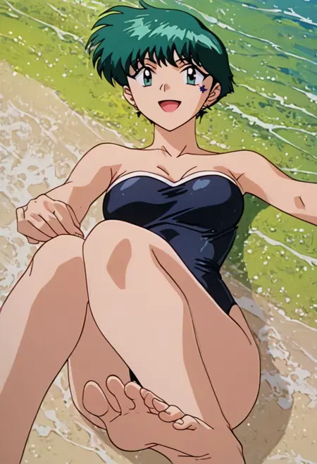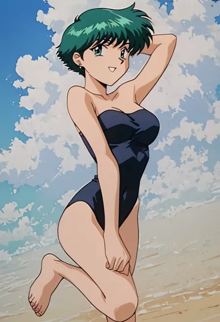 OutfitSwim, (black one-piece swimsuit, strapless,), barefoot,
