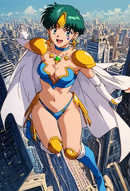 하이퍼돌스, 얼굴 마크, 별(기호), 파랑 비키니 갑옷, (흰색 망토, 파랑 내부 안감), 금색 어깨보호대, 흰색 팔꿈치 장갑, 금색 별 귀걸이, 금색 이마 보호대, 파랑 목걸이, 녹색 가슴 보석, 금색 무릎보호대, (파랑 부츠, 굽이 있는 부츠)