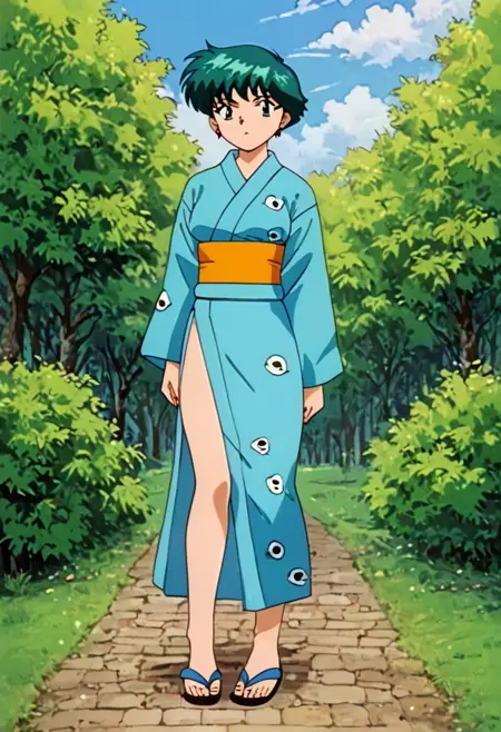 유카타 옷차림, 파랑 유카타, 긴 소매, 주황색 띠, 샌들