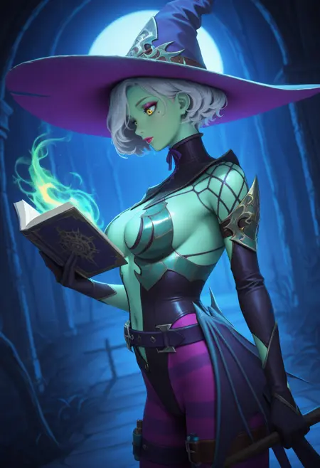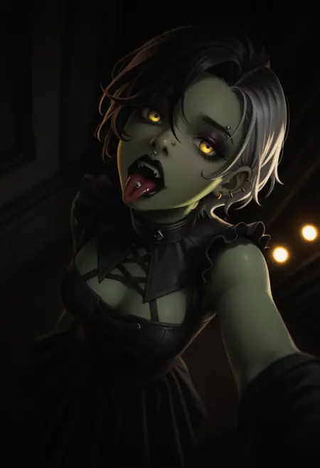 short hair, silver hair, yellow eyes, colored skin, green skin, makeup, lipstick, mole,