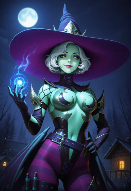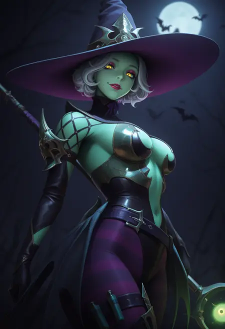 witch hat, leotard, cleavage, navel, belt, gloves, pantyhose, stripped, knee boots, high heels, wings,