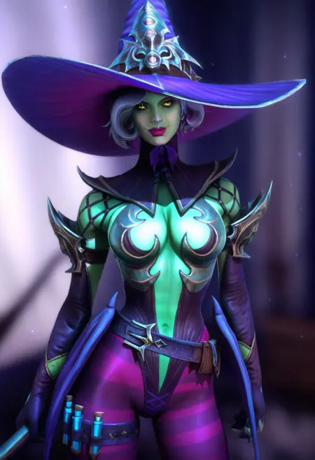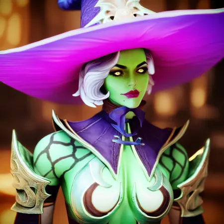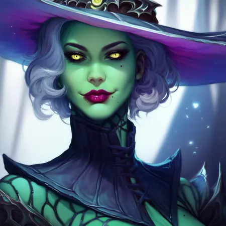 raidserris, witch hat, short hair, silver hair, yellow eyes, colored skin, green skin, makeup, lipstick, mole,