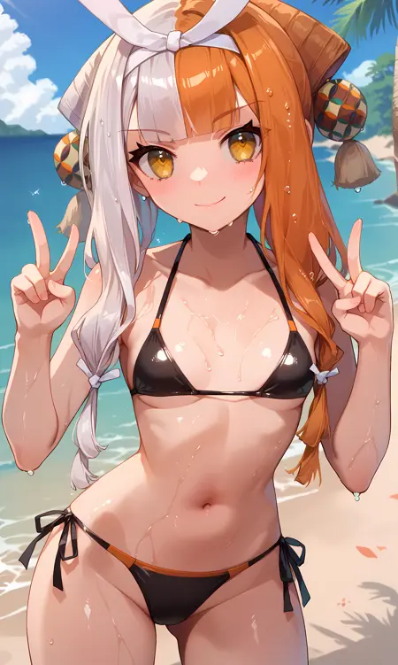 izumo_fgo, yellow eyes, white hair, orange hair, multicolored hair, two-tone hair, split-color hair, long hair, hair ornament, hairband