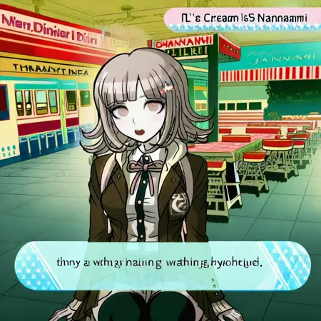 Danganronpa S GUI: This doesn't work all that well. And the chance of getting legible text is very low. But you can give it a try with variations on this text. "The image uses danganronpa S GUI style with the danganronpa sprite style. A speech bubble is in the bottom of the image and it says "This is test text!" The speech bubble is in front of Chiaki. There's a box with a blue background with white stars, and a grey arrow pointing right, beside the speech bubble. The text in the box says "Chiaki Nanami" and it is next to the speech bubble."