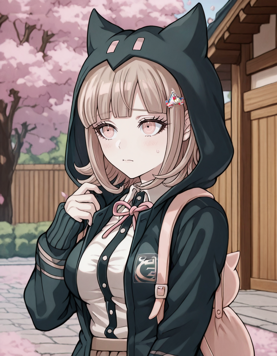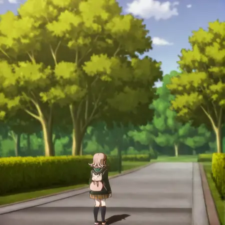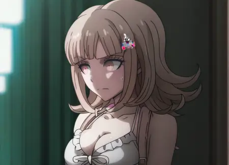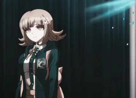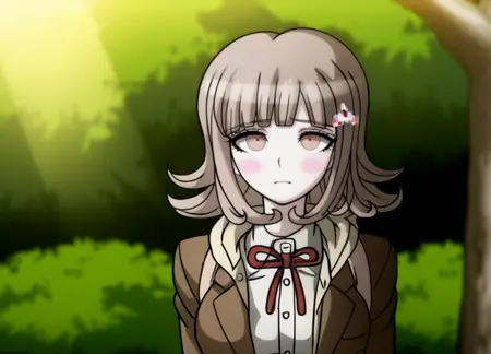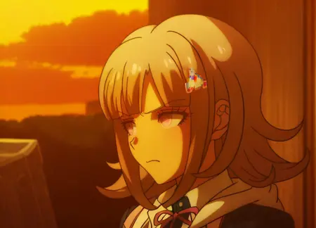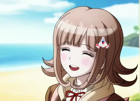 Hair: Chiaki's hair is annoyingly inconsistent in official material. The system can get a little confused about her hair color because spike chunsoft gets a little confused about her hair color too. When looking into it I saw a comment saying her hair is "Chiaki colored". A sentiment I've had to agree with because I'm never quite happy with how it turns out. Thankfully the lora seems fairly flexible with tweaking Chiaki's hair color. If you want to go more with the pink side of things then try "Chiaki Nanami's hair is a dusty pink." If you want to go more to light brown with a hint of pink, try "Chiaki Nanami's hair is a dusty light pink that is almost light brown."