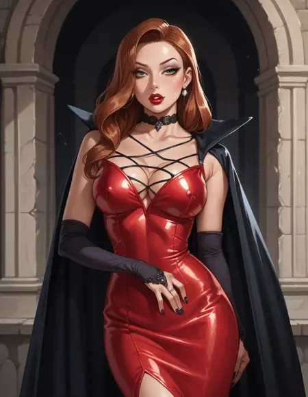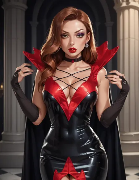 hud_sxyw1tch2, 검은 드레스, 빨간 드레스, 가슴 노출, 검은 브라이덜 장갑, 콜라, 립스틱, 검은 손톱, 투명한 검은 망토