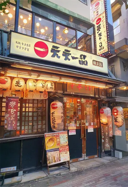 tenkaippin, poster (object), sign, shop, lantern, outdoors, road, street, paper lantern, window, food, storefront, door, building, night, pavement, lamp, lamppost,