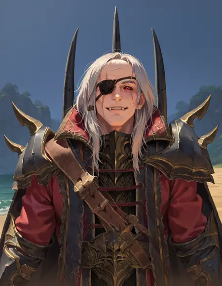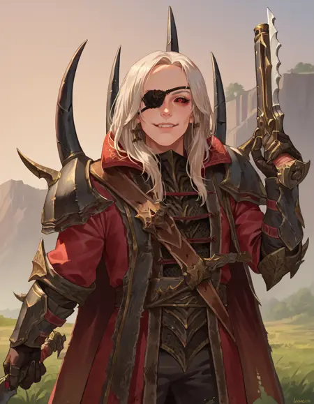 LuthorHarkon, red eye, black sclera, eyepatch, scar, undead, armor, cape,
