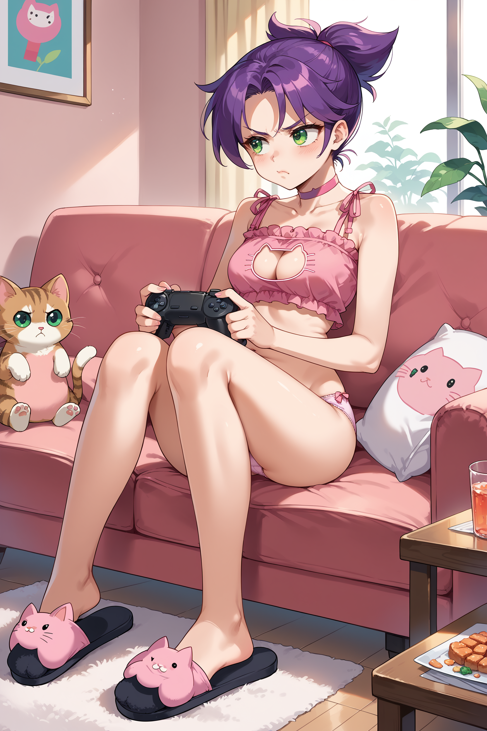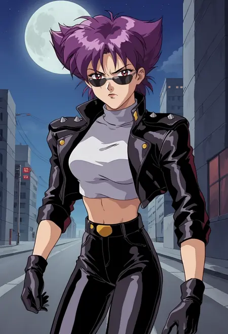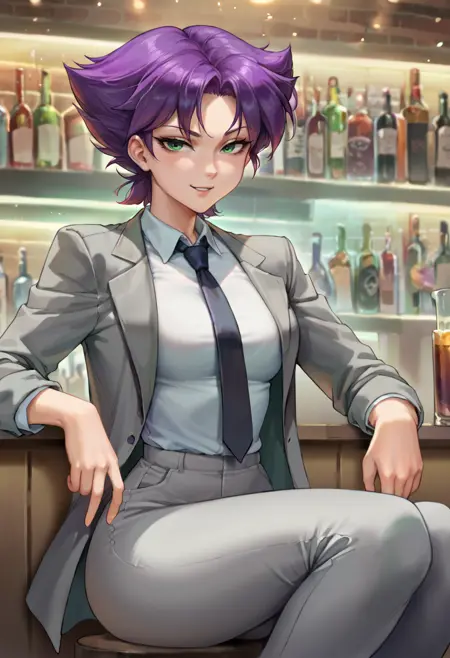 konoko ,1girl, 보라색 머리, 단발, 녹색 눈, 갈기 같은 머리