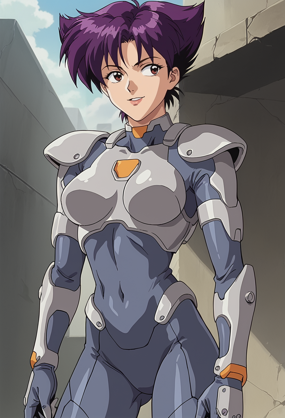 전술복, 회색 바디아머, 금속 벨트, 회색 허벅지 스트랩, 어깨 패드, 사이언스 픽션, 진한 파란색 바디수트, 손가락 없는 장갑, 무릎 패드, 주황색 부츠
