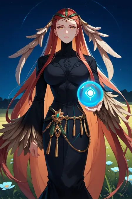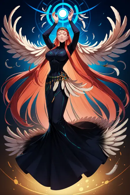 일반적인 외모를 원한다면 "깃털 장식, 깃털 머리 장식, 원형 관, 검은 드레스, 긴 드레스"를 추가하세요.