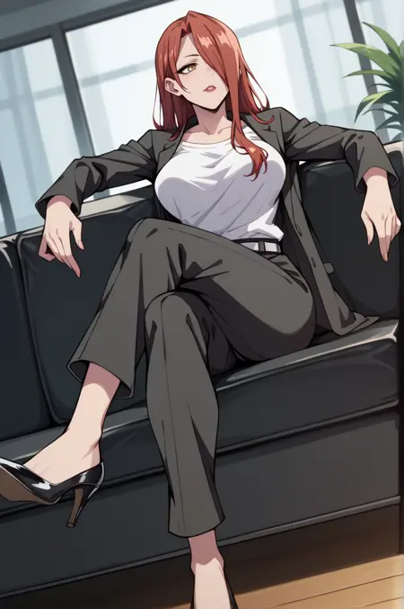 片目を覆う髪、折りたたんだポニーテール、長い髪、赤髪、黄褐色の瞳、大きな胸、リップスティック