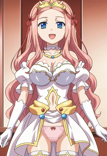 • 프림 퓨리어 (캐릭터) | 분홍색 머리, 긴 머리, 파란 눈, 큰 가슴, | 목걸이, 속옷, 분홍색 속옷, 허벅지 양말, 왕관, 리본, 머리 리본, 치마, 장갑 | 드레스