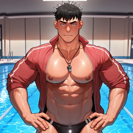 프롬프트: coach_outfit, 빨간 재킷, 목에 휘슬