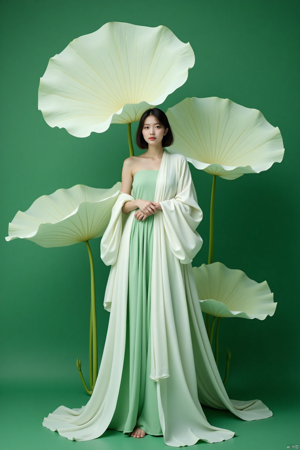 推奨プロンプト:蓮の葉の中に写された写真。女性が大きな白い花を背景に立っている。女性の服は、薄緑色のノースリーブのドレスに加え、肩に長い白いローブをまとっている。髪型はスムーズなボブカットで、情景に美しさを添えている。背景は鮮やかな緑色で、白い花と女性とのコントラストを際立たせている。