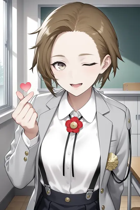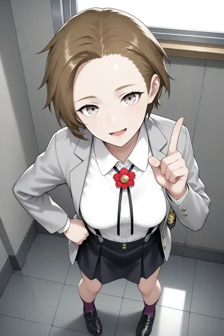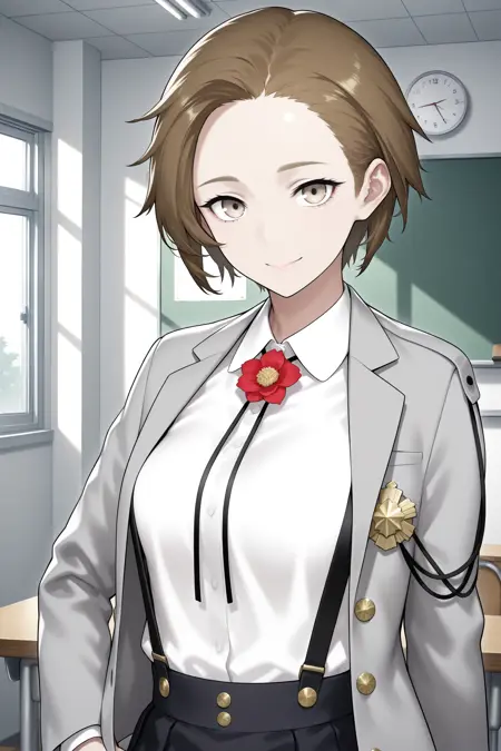 caligula female protagonist, short hair, brown hair, brown eyes, school uniform, long sleeves, grey jacket, open jacket, white shirt, medal, flower, suspenders, black skirt, pleated skirt, miniskirt, purple socks, loafers