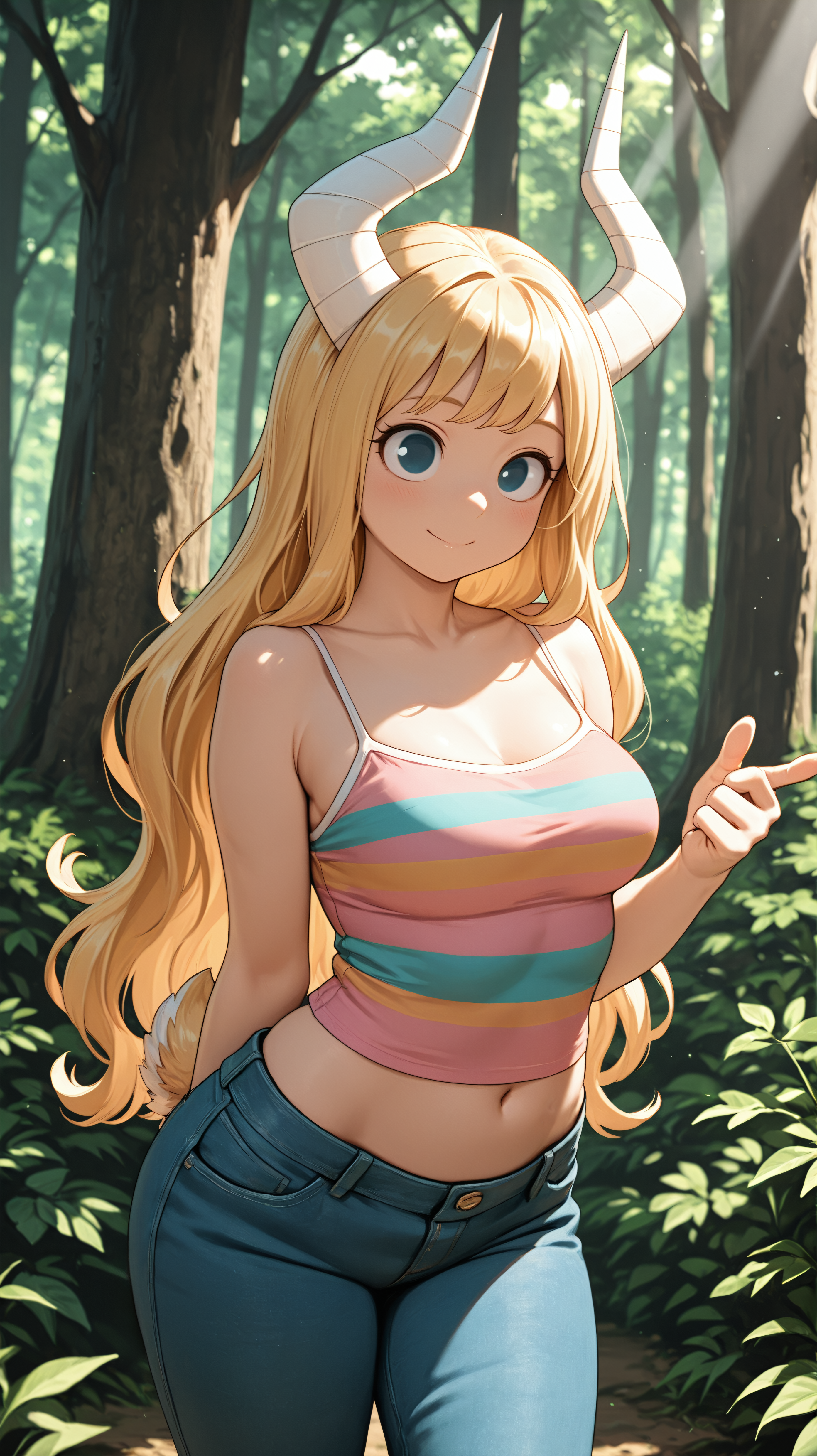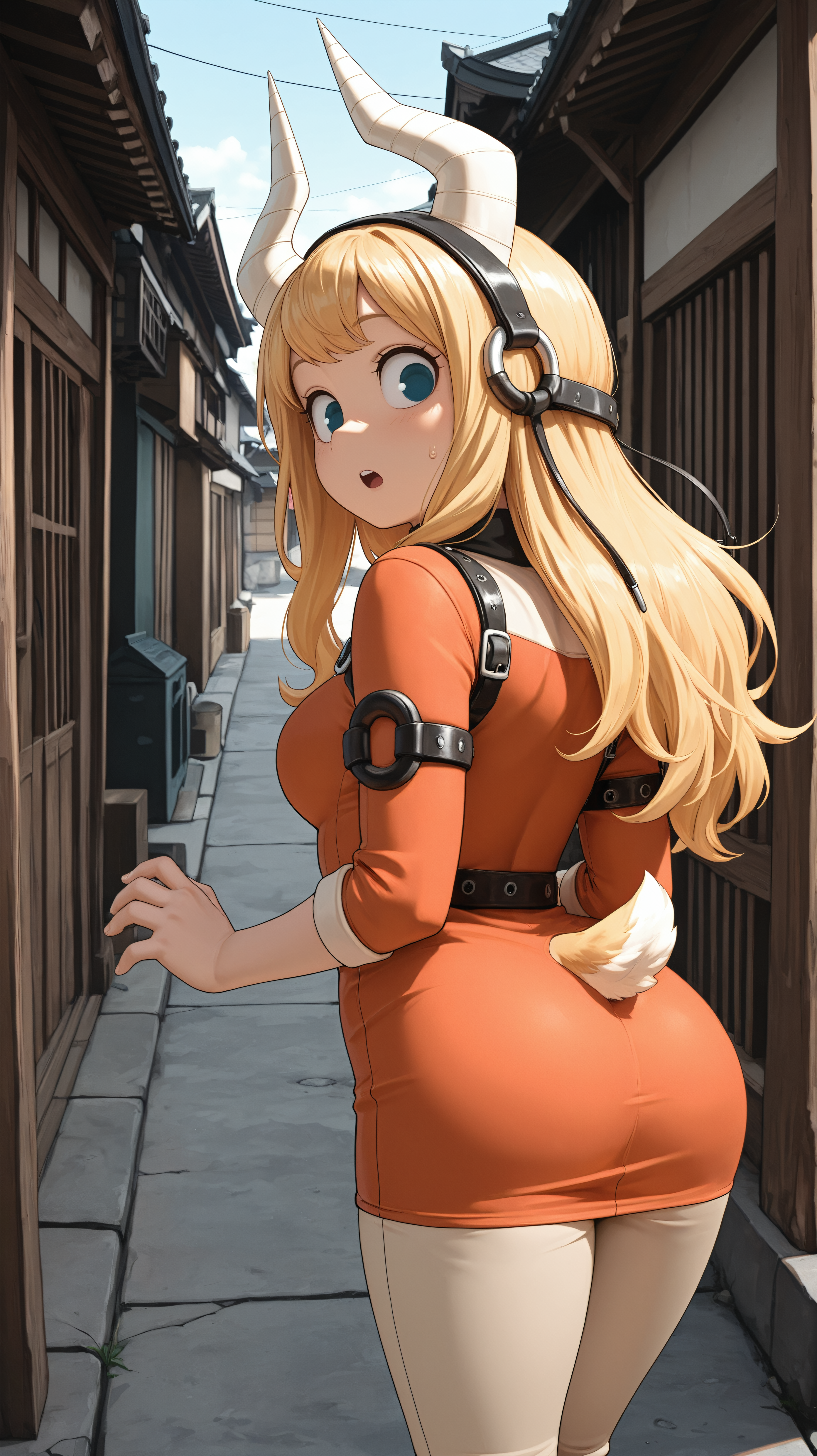 long hair, blonde hair, large horns, white horns, blue eyes, large eyes, black hairband, black collar, orange dress, leather straps, leather armlet, beige pants, yellow tail, short tail, short girl, hsuit1,