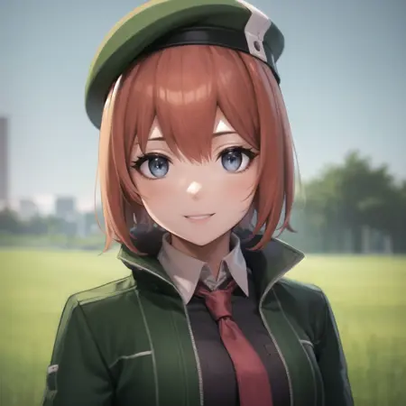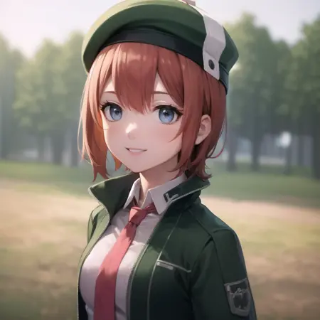 green_headwear, green_jacket, grey_undershirt, red_necktie, black_thighhighs, brown_gloves, brown_boots,