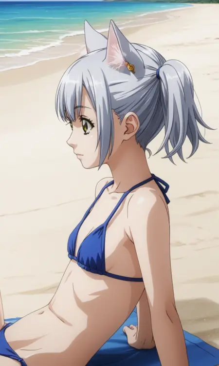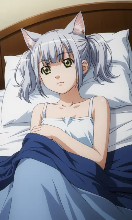chaika, 1girl, green eyes, silver hair, short twintails, cat ears, cat tail,
