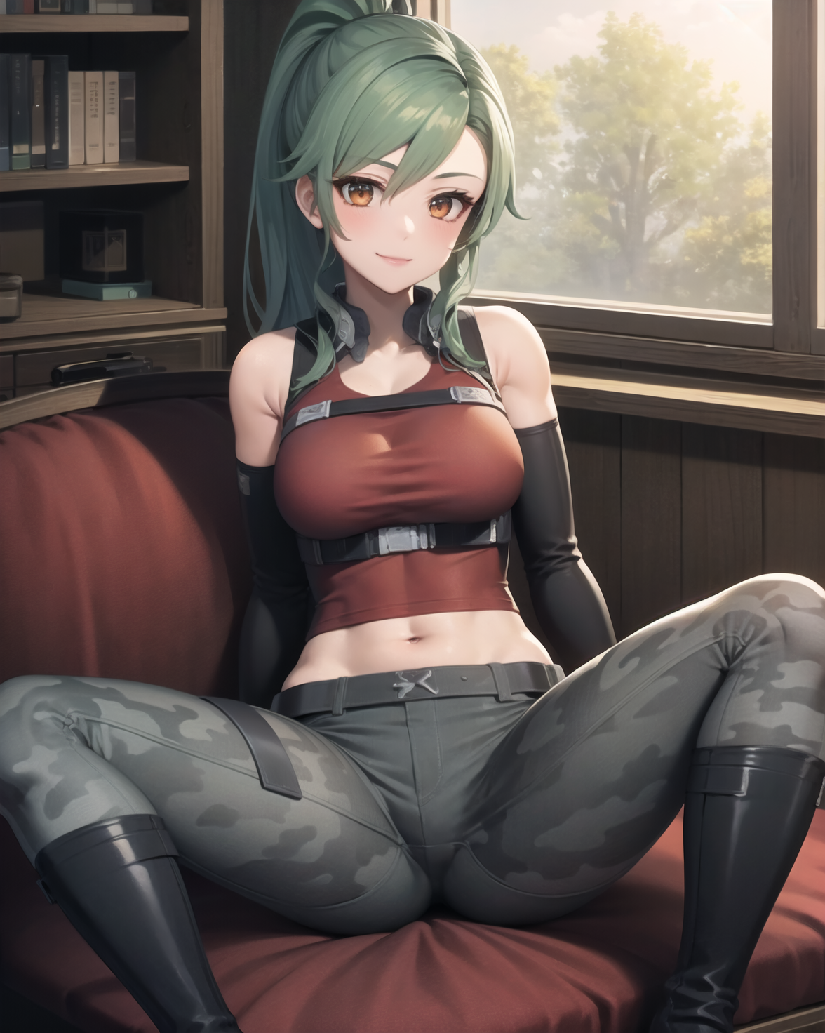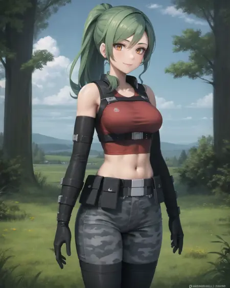 <lora:Aida-08:0.8>, 绿色头发, 马尾辫, 橙色眼睛, 中等胸部, (腹肌:0.8),