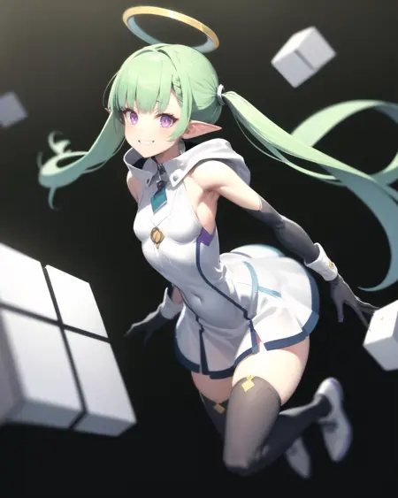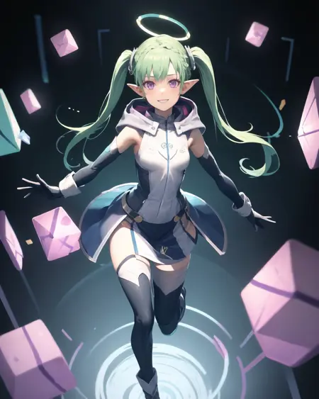 <lora:Mare-08:0.8>, Mare, 长发, 绿发, 双马尾, 紫色眼睛, 机械光环, 微小, 纤细, 小个子, 小胸,