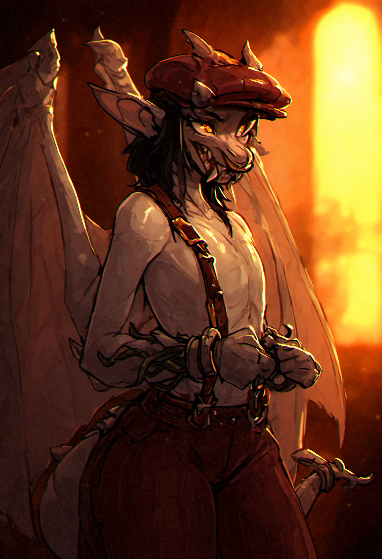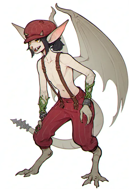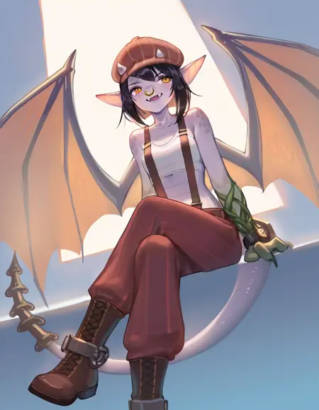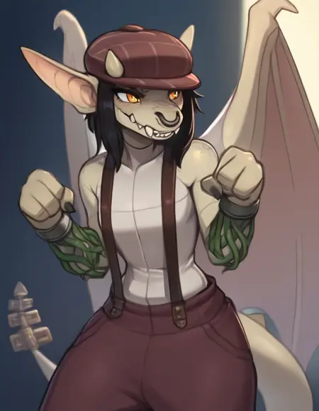 deadlock \(game\) ivy_\(deadlock\) valve gargoyle 1girl furry female monster girl yellow_eyes dragon girl scales animal ears pointy ears furry black hair piercing fangs horns snout nose piercing nose ring tail teeth big dragon wings two-tone grey skin short tail ornament flat chest cabbie hat suspenders bracelet
