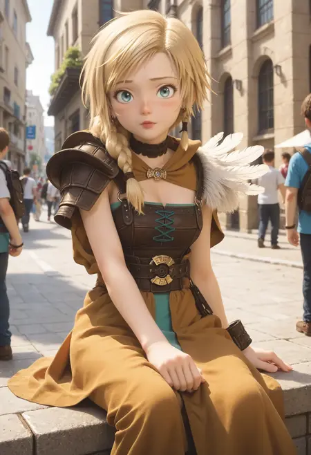 DQYS-bianca, blonde hair, short hair, braid, blue eyes, earrings, brown choker, armored dress, dress, skirt, armlet, boots,