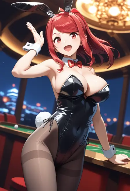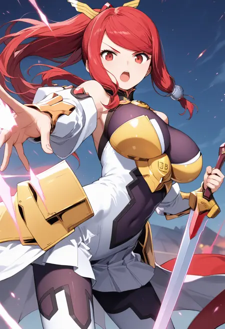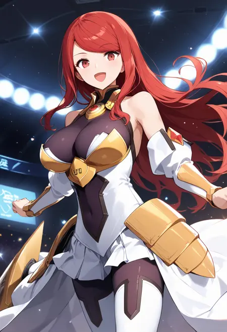 bodysuit, bare shoulders, turtleneck, breastplate, armor, detached sleeves, miniskirt, white skirt, black pantyhose, white thighhighs, large breasts, red hair, swept bangs, ponytail, sidelocks, hair ornament, red eyes, (tsurime:1.3), (v-shaped eyebrows:0.5)