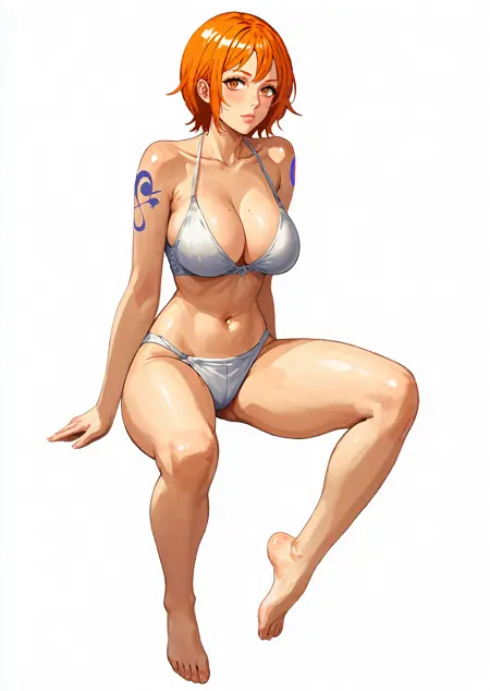 相关提示词:1girl, solo, breasts, orange hair, simple background, cleavage, orange eyes, looking at viewer, lips, white background, swimsuit, bikini, shoulder tattoo