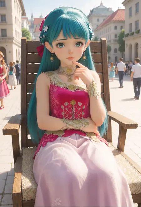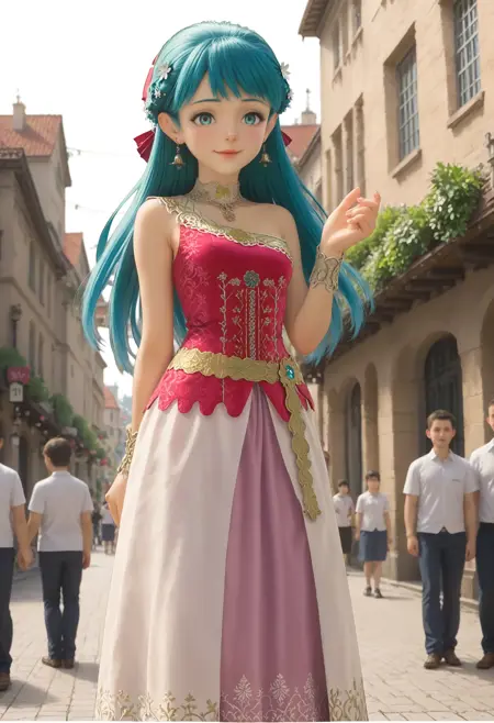 DQYS-flora, aqua hair, long hair, aqua eyes, earring, hair ornament, choker, pink dress, bracelet, long skirt, red shoes,